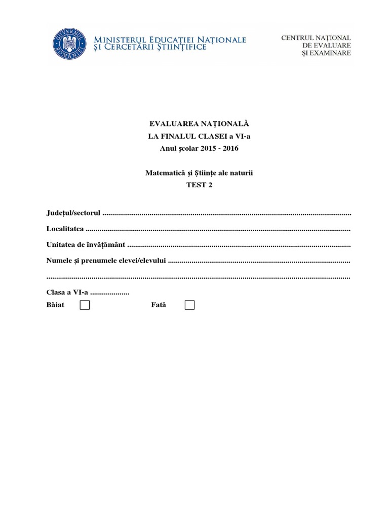 Evaluare clasa a vi a matematica si stiinte 2016.
