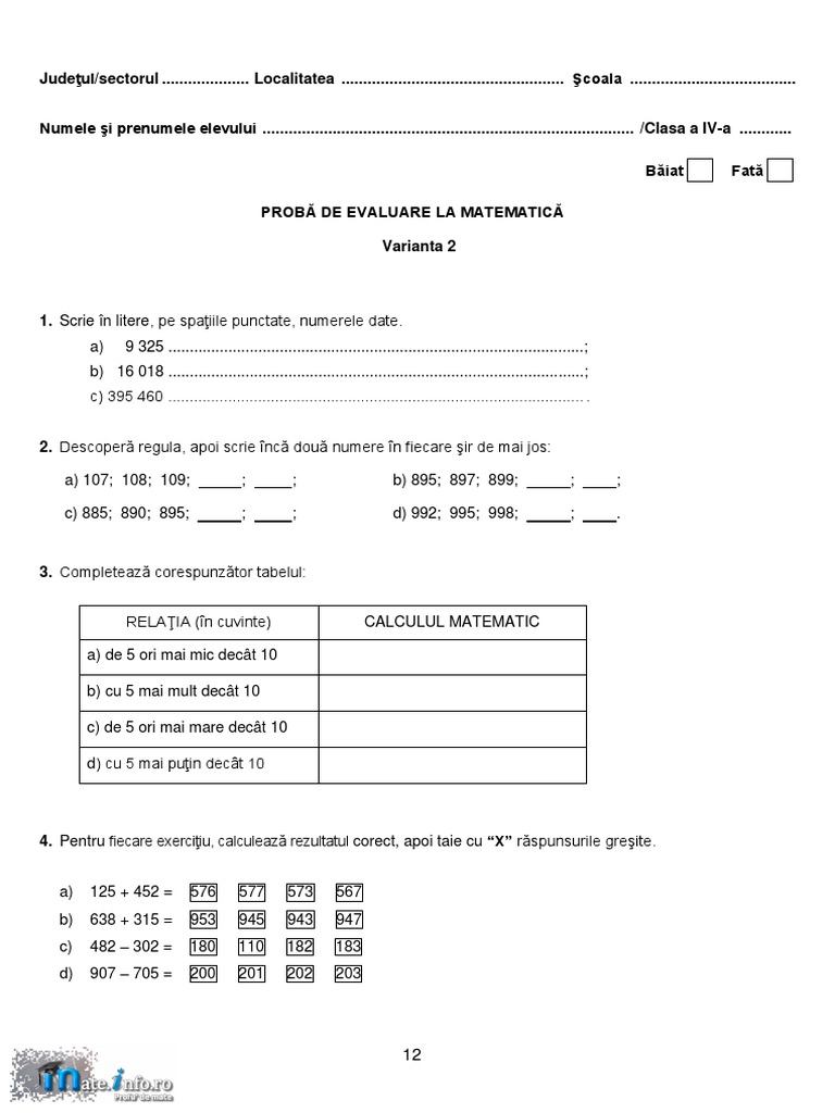 Sursa edu ro subiecte date modele edu clasa a 4 a evaluarea națională 2018 limba română matematică test 1 test2 edu ro evaluarea națională pentru clasa a 4 a 2018 subiecte matematică 16 05 2018 test 1 test 2. Clasa pregătitoare simulare evaluările de la finalul claselor a ii a a iv a și a vi a evaluarea națională pentru absolvenții clasei a viii a bacalaureat titularizare definitivare concurs directori și directori adjuncți website actualizat la data de 12 12 2019. Evaluare finală matematică clasa a iv a cu interpretare. Testele pe care le au sustinut elevii sunt corectate in scoala pe care o urmeaza copiii de catre profesorii de la aceasta scoala.