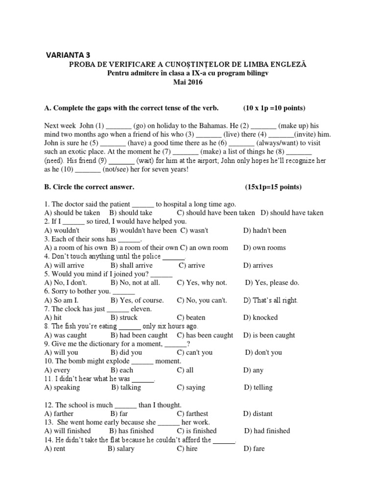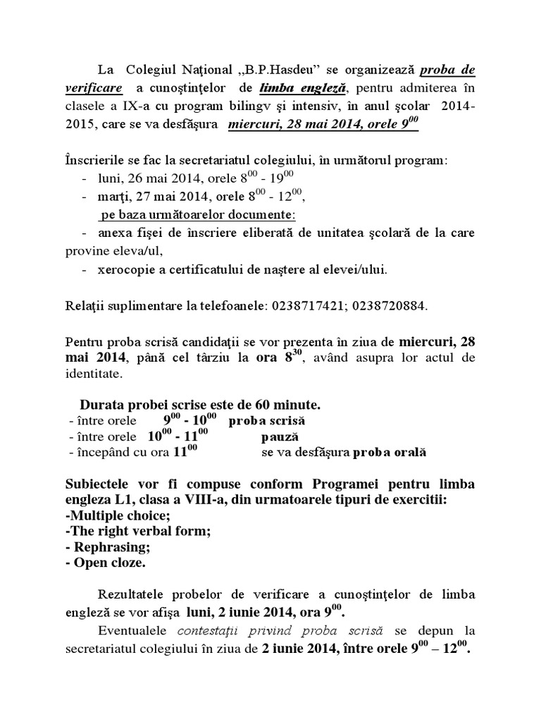 Examen bilingv engleza clasa a8a 2016. 15 iunie 2016 11 00. 2012 admitere bilingv. Testul cuprinde trei exercitii unul de testare a vocabularului altul de verificare a prezentului simplu prezentului continuu trecutului simplu si a viitorului iar al treilea exercitiu o compunere cu tema data. Rezultatele se vor afişa în data de 22 05 2018 ora 10 00.
