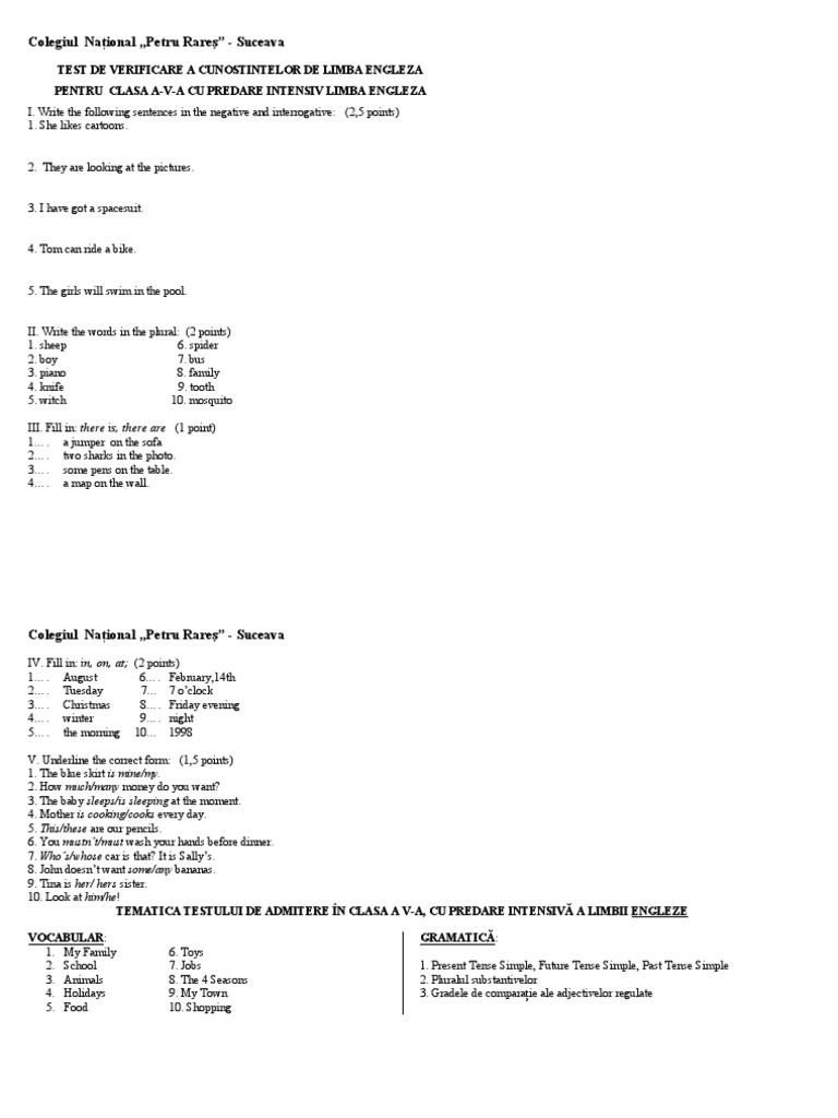 Test pentru admiterea la clasa a v a cu predare intensiv limba engleza subiecte examen intensiv engleza clasa a v a.