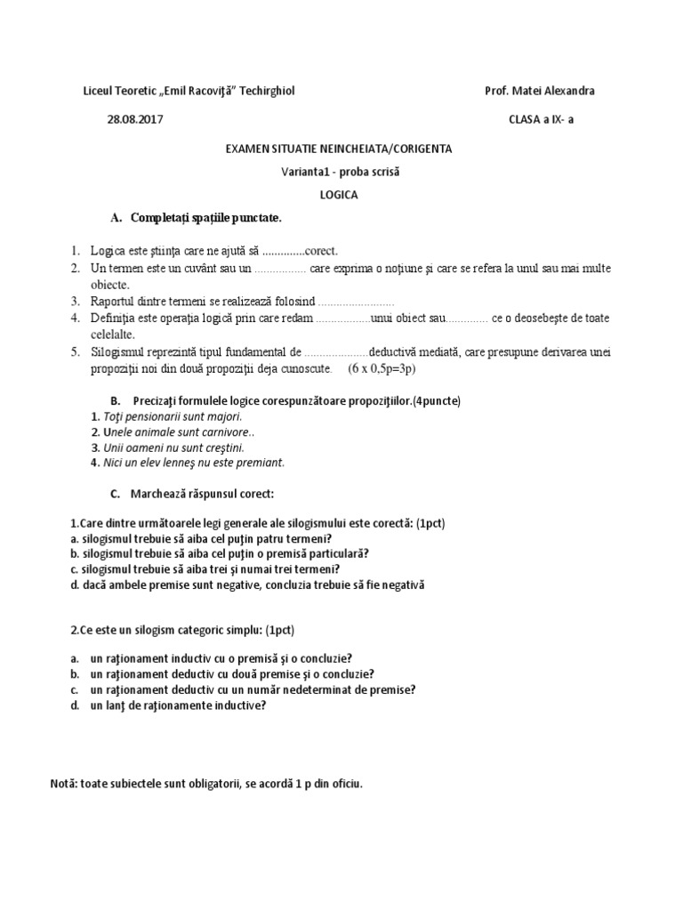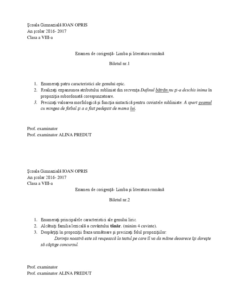 Bilete si variante examen de corigenta clasa a vi a. Elevii din clasele terminale de liceu care au sustinut si promovat examenul de corigenta se pot inscrie pentru examenul de bacalaureat sesiunea de examen august septembrie 2017 in data de 27 iulie 2017. Examen de corigenta clasa a 10 a 2 oresapt. A rezultatul calculului 4 1 2 1 este egal cu.
