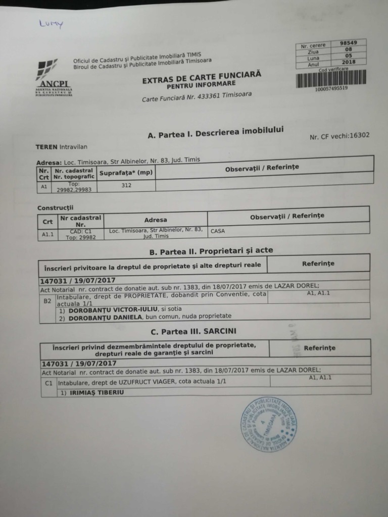 Cerere pentru consultare documente din arhivă. Extras de carte funciara pt informare. Este un extras de carte funciara de informare livrat pe email care contine un cod de verificare inregistrat la ancpi. Nu poate sta la baza unei tranzactii adica nu se poate incheia un contract de vanzare cumparare pe baza acestui extras.