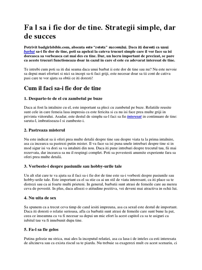 Fa l sa ii fie dor de tine suntem fete iar arma este la noi doar putin efort si putem da dauna. Exista cateva trucuri care te ar putea ajuta sa i provoci dependenta de zambetul privirea vocea si sarutarile tale. Controversa unui mariaj care rezistă de peste 20 de ani. Oferindu i posibilitatea de a face acest lucru acesta va avea mai multă încredere în tine.