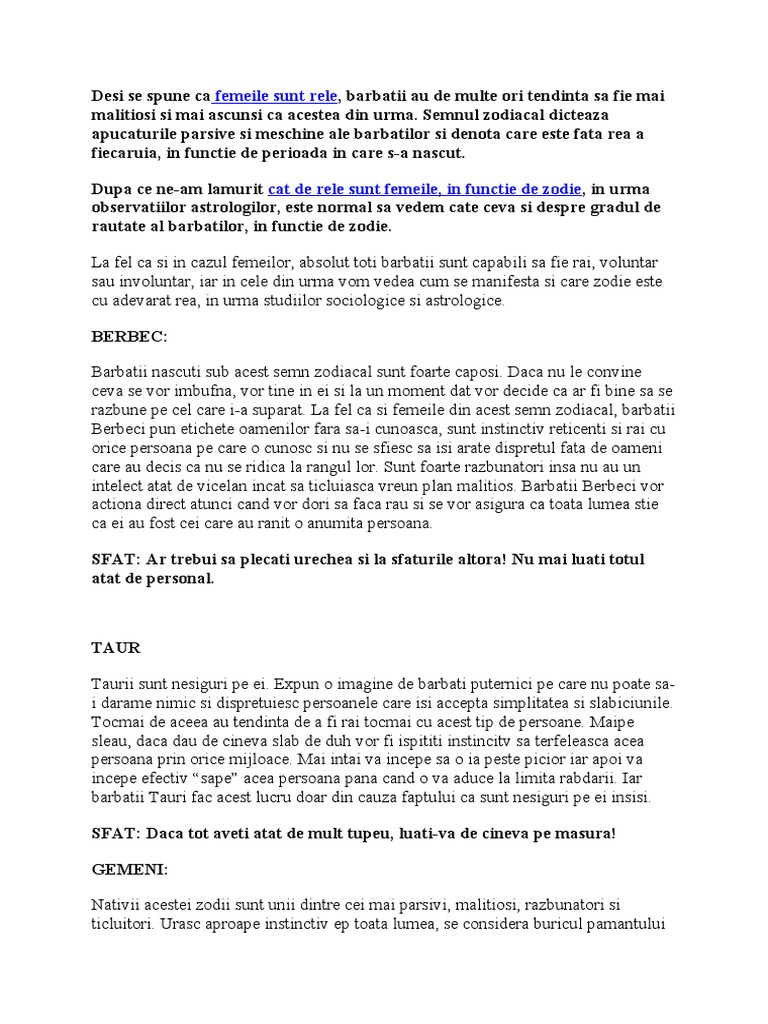 Fa l sa te iubeasca in functie de zodie. Prin urmare dă frâu liber fanteziilor tale și nu te preocupa de plăcerea lui pentru că dorința sa cea mai puternică este ca tu să te simți bine. Cauta si tu semnul sau zodiacal printre randurile ce vor urma si fa l sa te iubeasca. Are nevoie de cineva care sa il provoace in mod constant sa il determine sa. De mare ajutor poate fi găsirea unui hobby comun.