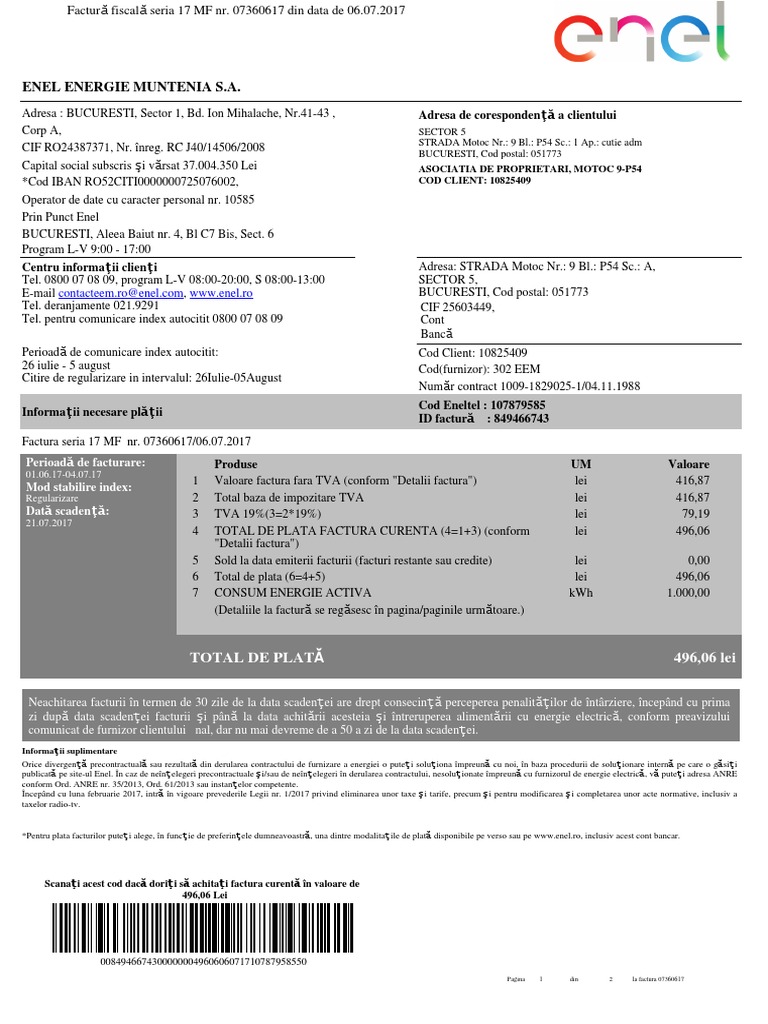 Factura enel cod client. La detalii plata eu trec mereu plata factura din data de cod client. Cod furnizor id factura nr contract cod enel tel cititi cu atentie prima pagina. Codul eneltel il gasesti in chenarul rosu unde scrie cod plata. Compania enel a lansat o platformă online prin care clienţii români îşi pot accesa factura de energie electrică pot afla informaţii despre istoricul şi evoluţia datelor de consum dar şi despre plăţile efectuate.