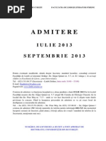 în situația în care locurile scoase la concurs nu se vor ocupa integral în perioada 2 20 septembrie se va organiza o nouă sesiune de admitere sesiunea de toamnă. Declarația pe propria răspundere anexa 8 se scrie de mână și se scanează. în perioada 01 08 2018 02 09 2018 comisia de admitere a facultății de litere nu lucrează cu publicul. Fiecare pagină din dosar se numerotează și se semnează jos în partea dreaptă.
