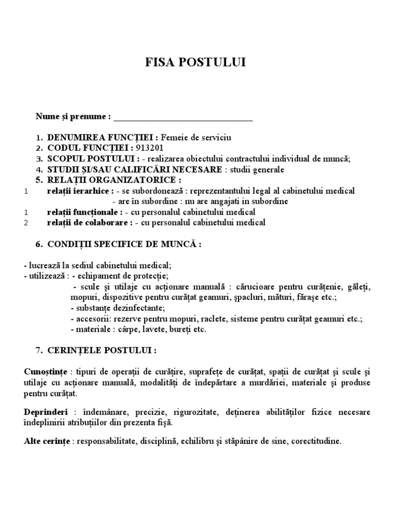0734727651 oferte munca in strainatate bacau. Denumirea si descrierea au ramas la fel in ordinul 1635 342 2018 al mmjs ins. Fisa de post femeie de serviciu sau menajera doc.