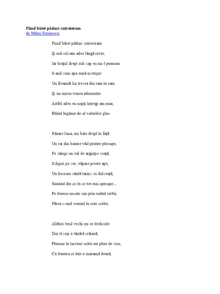 Poezia fiind băiet păduri cutreieram de mihai eminescu. Fiind băiet păduri cutreieram şi mă culcam ades lângă izvor iar braţul drept sub cap eu mi l puneam s aud cum apa sună ncetişor. Fiind baiet paduri cutreieram de mihai eminescu. Poezia fiind băiet păduri cutreieram publicată postum este o sinteză lirică a câtorva teme specifice poezii eminesciene.