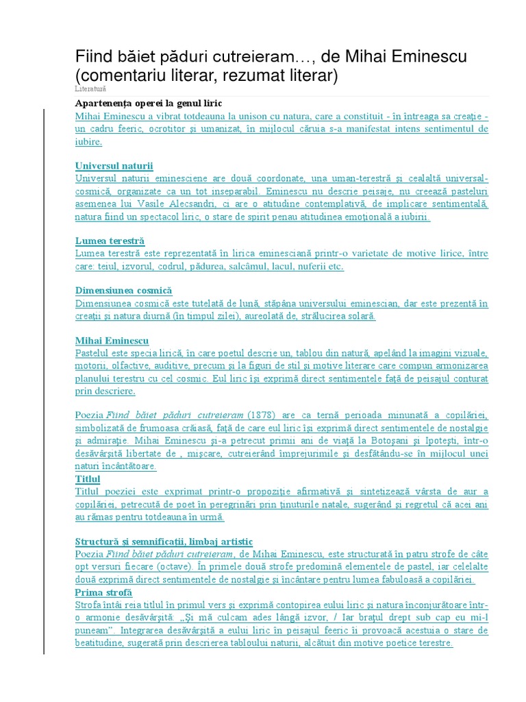 Fiind baiet paduri cutreieram vraja codrului il facea sa descopere cu uimire fiorul vie tii ce anina totul flori albastre care tremur ude in vazduhul tamaiet izvoarele care trec peste pietre coboara si suspina in flori mii de fluturi mici albastri mii de roiuri. Luminita7pit scoala gimnaziala nr 7 pitesti. De asemenea în acest caz comentarea strofelor coincide cu crearea unui rezumat al operei fiind băiet păduri cutreieram. Fiind baiet paduri cutreieram rezumat fiind baiet paduri cutreieram a fost odata un copil care a fost prieten cu codrul cu crangurile cu poienile cu raurile si cu lacurile acestuia ii placea sa iasa adesea si sa cutreiere codrul pier zandu se in visare atuci codru i parea o cetate fermecata ce parca i vorbea cu glas mandru de argint.