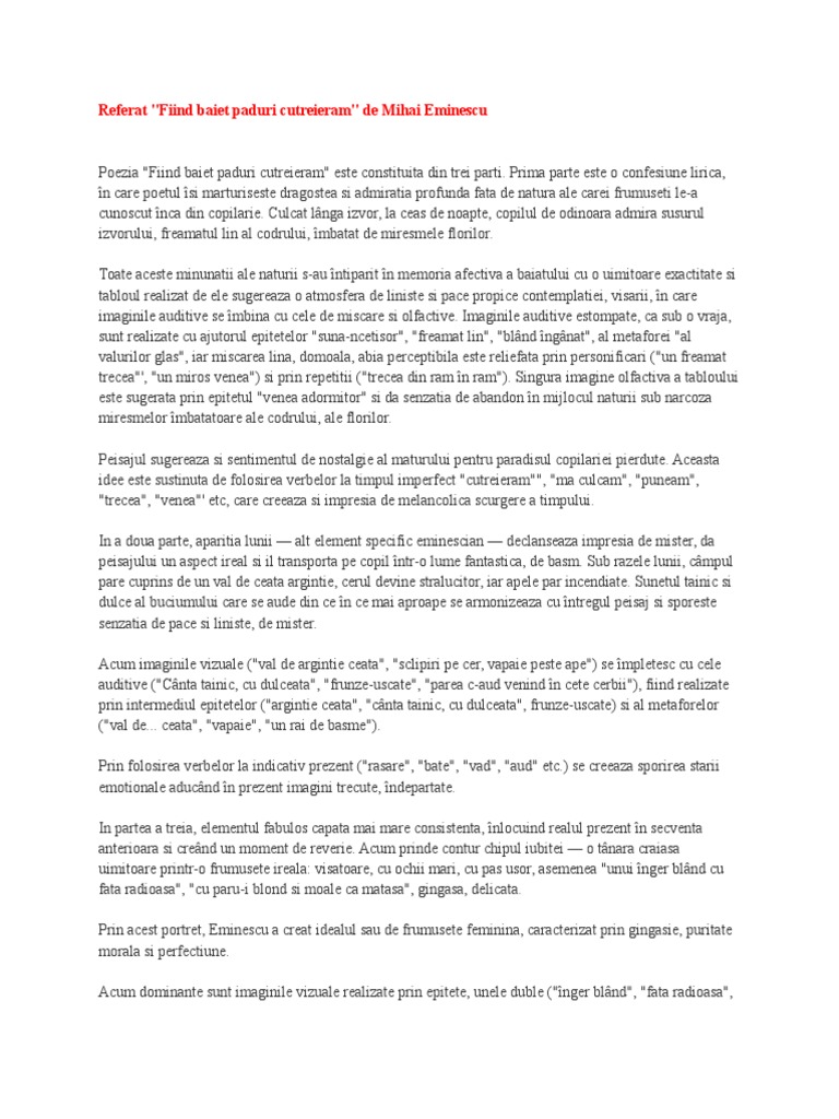 Fiind baiet paduri cutreieram rezumat. Rasare luna mi bate drept in fata. Mai tarziu el hoinarea prin sat timp de o saptamana amintindu si despre asta in poeziile sale calin nebunul fiind baiet paduri cutreieram o ramai trecut au anii admirand codrii teii lacul turmele cu ciobanii lor si nu in ultimul rand povestile batranesti. Un rezumat pe scurt realizat corect va demonstra faptul că ai memorat imaginile evenimentele prezentate în textul studiat. Astfel ades eu nopţi întregi am mas blând îngânat de al valurilor glas.