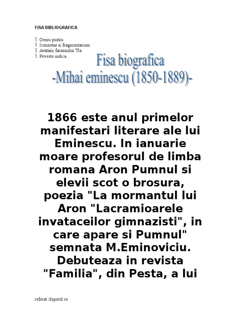 Fisa biografica a lui mihai eminescu. Mihai eminescu o biografie pe scurt. Viața și opera lui mihai eminescu referat. învăţământ primar limba şi literatura român ă. Un model de fisa biografica pentru elevi.