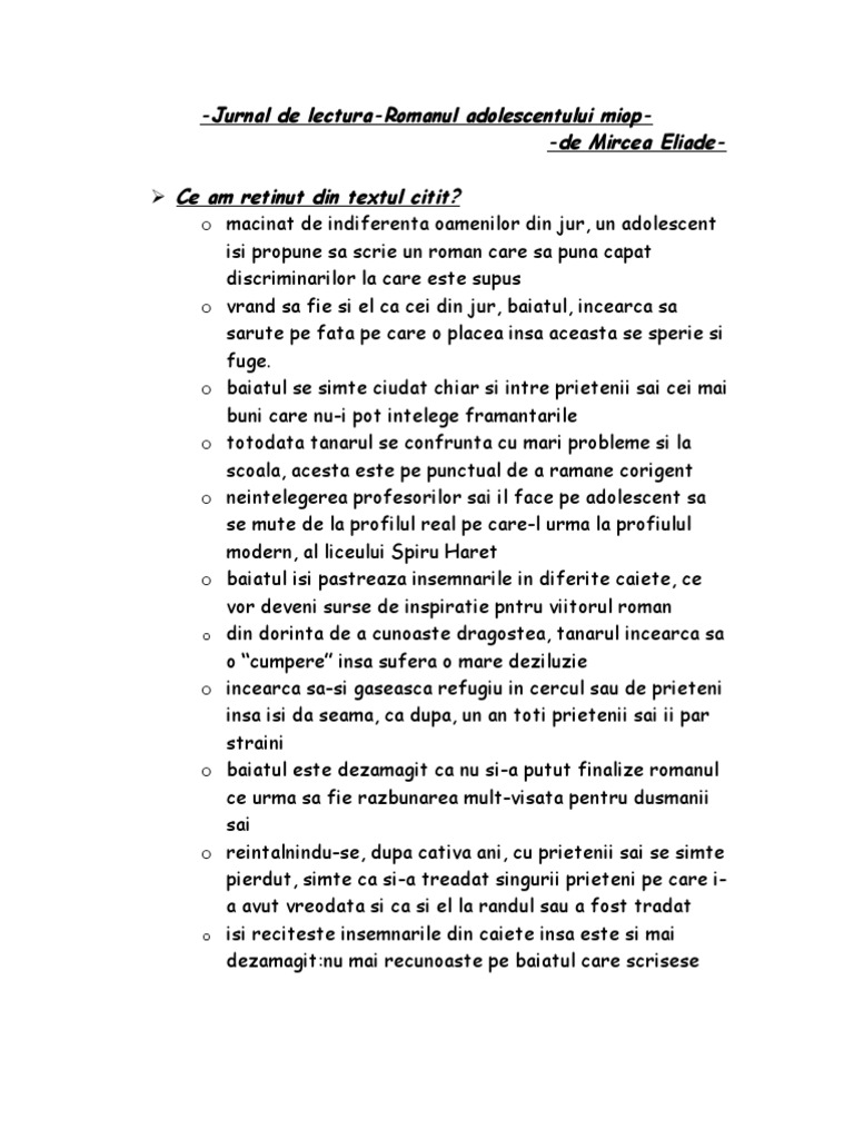 Fisa de lectura romanul adolescentului miop. Trebuie sa scriu un roman prima scriere a reputatului istoric al religiilor este romanul adolescentului miop aparut din grija de a nu uita vremurile trecute. Romanul adolescentului miop fisa de lectura partea i i. Framantarile unui adolescent ce trebui sa treaca peste multe obstacole pentru a se regasi. Fisa de lectura romanul adolescentului miop alguien sabe pide más detalles.