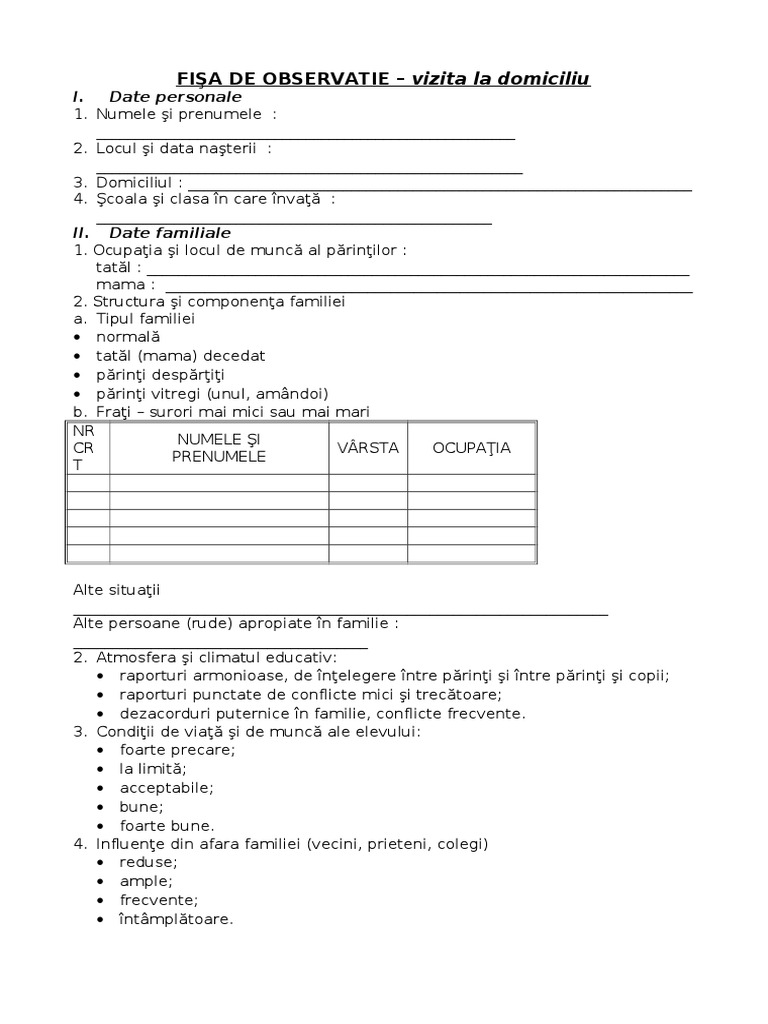 Fisa de observatie vizita la domiciliu. Tot ce aveti de facut este sa descarcati acest model de foaie sau fisa de observatie clinica si sa il adaptati nevoilor dvs. Salvar salvar fişa de observatie vizita la domiciliu para ler mais tarde 1 1 voto positivo marque este documento como útil 0 0 voto negativo marcar este documento como inútil incorporar compartilhar. Download fişa de observatie vizita la domiciliu save fişa de observatie vizita la domiciliu for later 73382418 fisa de observatie a comportamentului copilului in timpul jocului 3 5 ani. 06 noiembrie 2009 15 40.