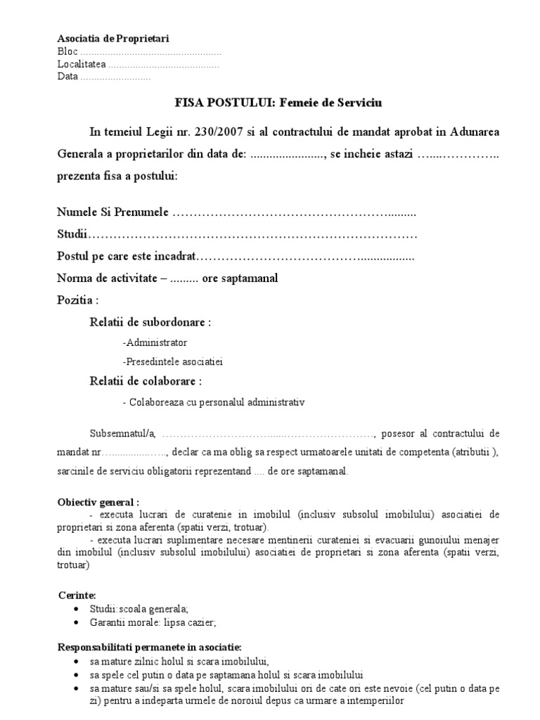 Fisa de post femeie de servici 1. 1 an atributii si responsabilitati. Download fisa postului medic. De solicitarile membrilor asociatiei de proprietari si in masura in care acestea corespund cu cerintele sarcinilor de serviciu stabilite in prezenta fisa le duce la ndeplinire in ordinea prioritatilor 9.