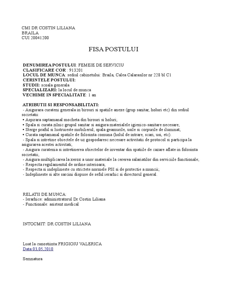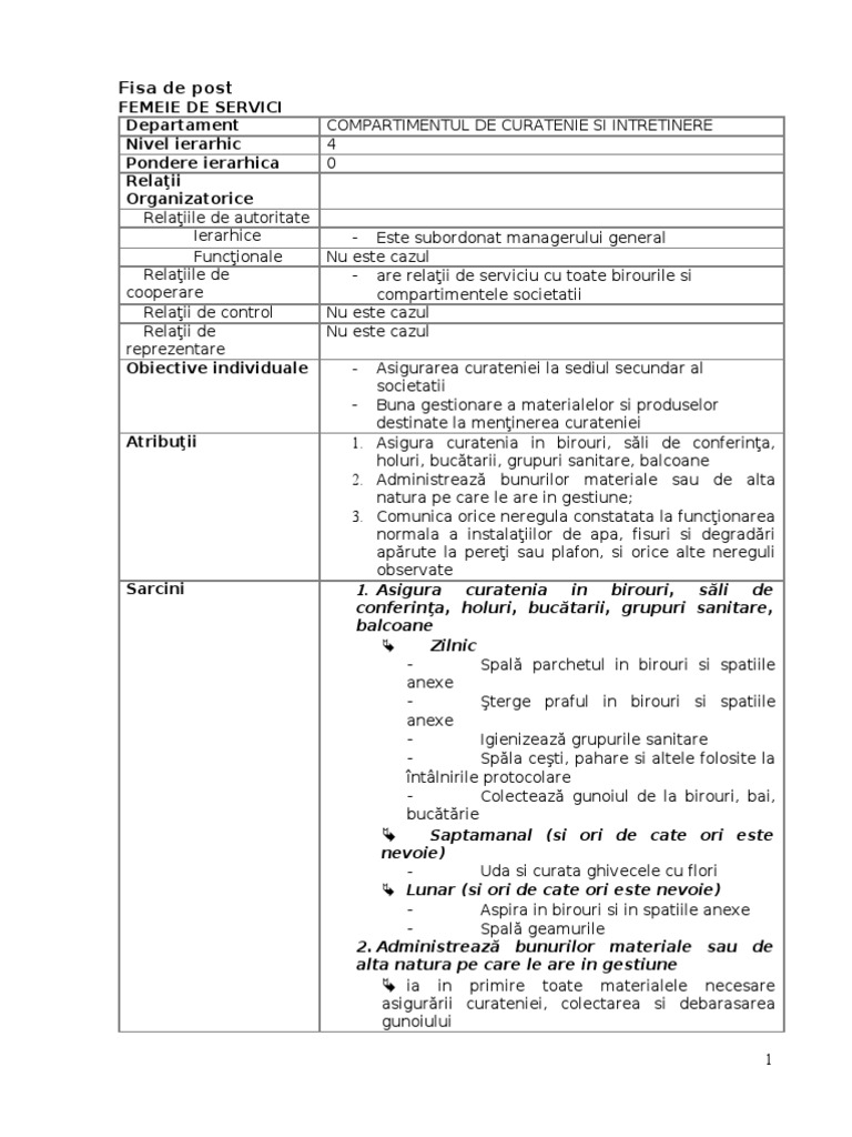 Fisa Post Femeie De Serviciu Doc