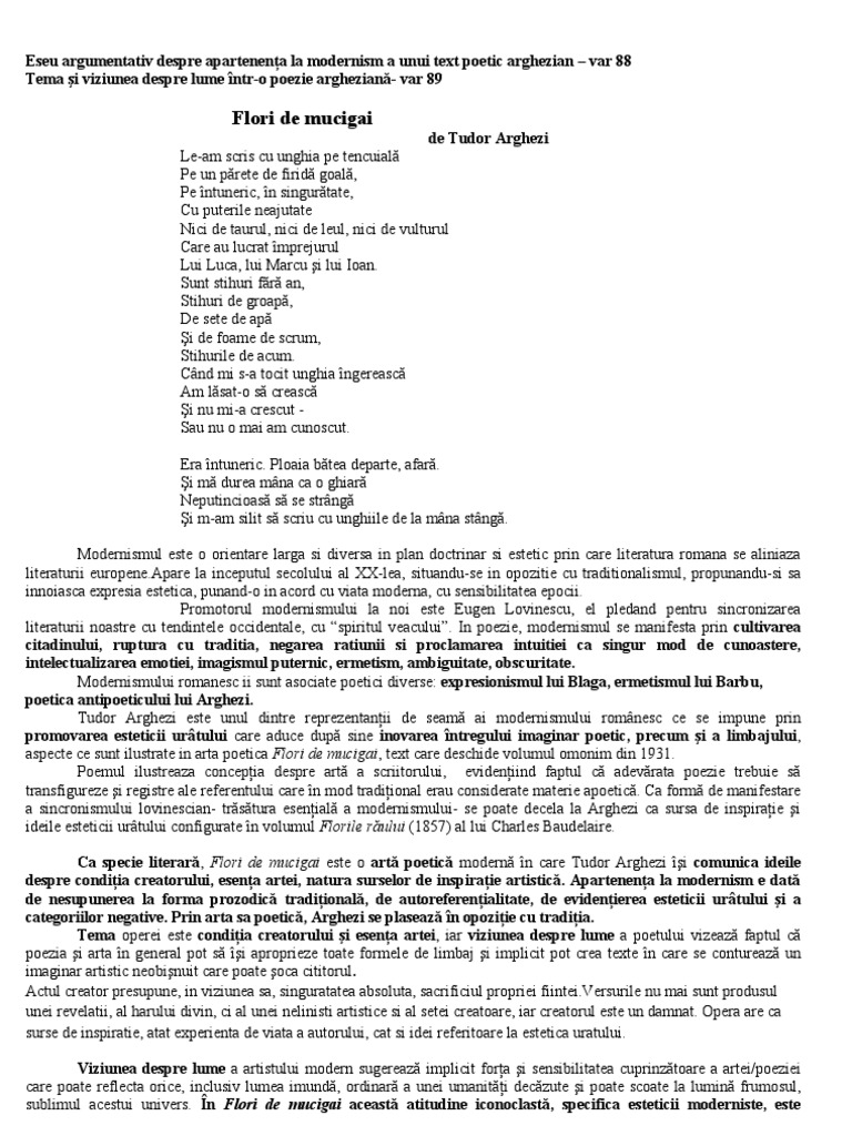 în elaborarea eseului vei avea în vedere următoarele repere evidenţierea. Opera literara flori de mucigai apartine genului liric si este o arta poetica moderna. Perfectiunea formei parfumul care declanseaza amintirii culoarea ireala sau poate o poezie ca inca nu a fost scrisa. Pentru a ți fi mai ușor să evidențiezi tema poeziei flori de mucigai și viziunea despre lume a poetului tudor arghezi își recomandăm să citești această pagină.