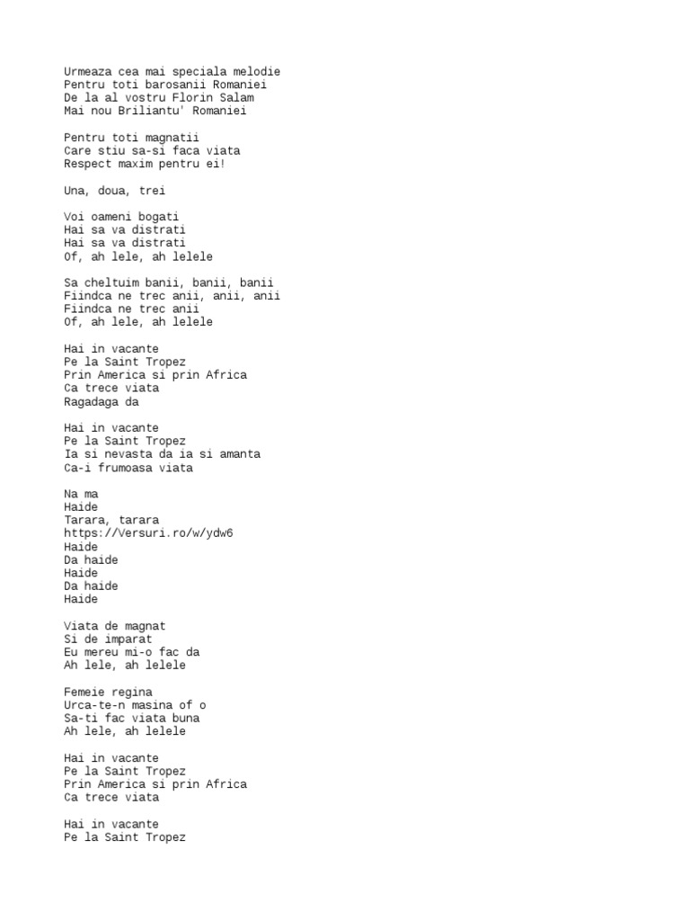 Florin salam versuri saint tropez urmeaza cea mai speciala melodie pentru toti barosanii romaniei de la al vostru florin salam mai nou briliantu romaniei pentru toti magnatii care stiu florin salam saint tropez lyrics. Marți 23 aprilie 2013 07 55 voi oameni bogati hai sa va distrati hai sa va distrati of ah lele ah lelele. Florin salam saint tropez versuri top manele din 2020. 10 zile 30 de zile 2 luni 4 luni.