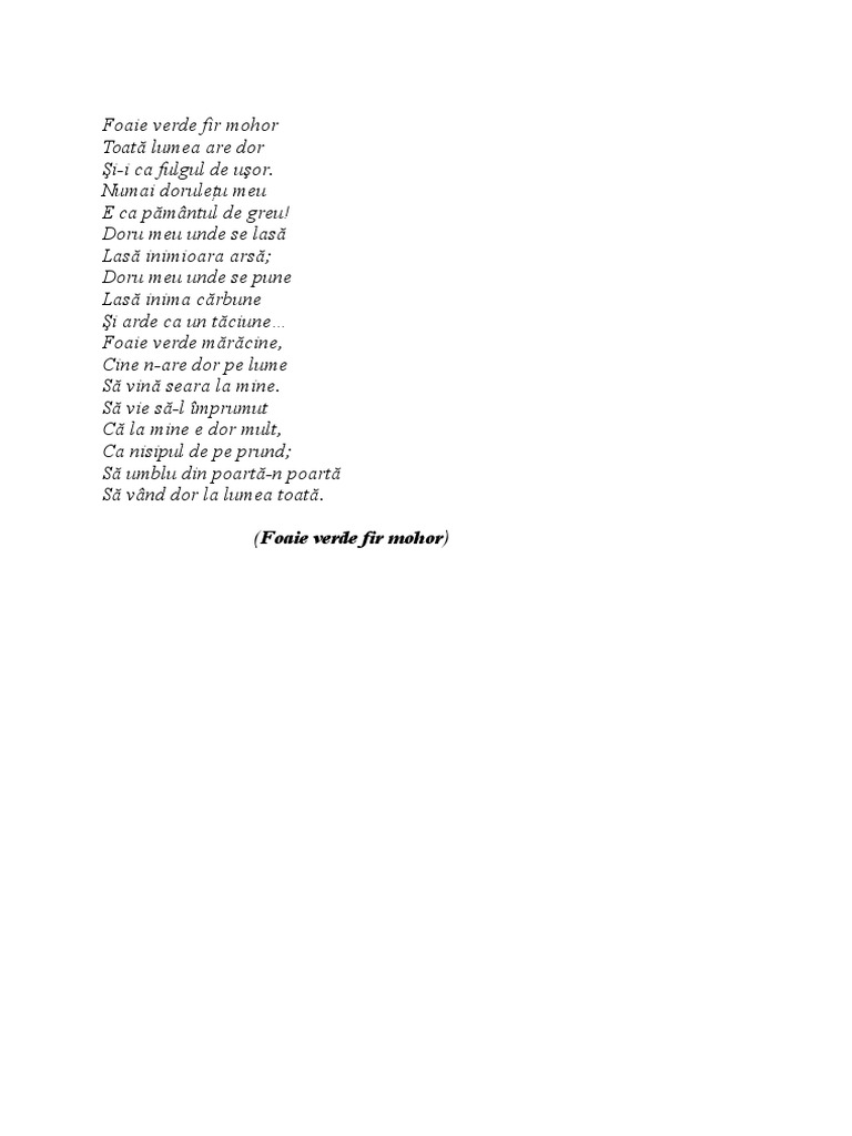 Ion ar fi avut mai mult noroc de avere dacă juca la loto. La punctul b al aceluiasi subiect elevii au avut de redactat in 150 200 de cuvinte o compunere in care sa motiveze apartenenta la specie a doinei populare foaie verde fir mohor. Puteti gasi foarte multe referate accesand categoriile din partea dreapta despre doina de dragostefoaie verde fir mohor uita te mai jos si o sa gasesti cele mai relevante rezultate pentru cautarea doina de dragostefoaie verde fir mohor. Foaie verde fir mohor toată lumea are dor şi i ca fulgul de uşor.