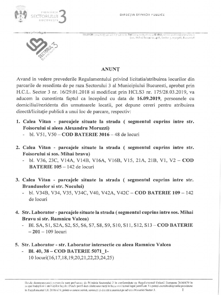 Conditii participare la atribuirea unui loc de parcare. Directia generala impozite si taxe locale sectorul 3 prelucreaza datele cu caracter personal ale contribuabililor in conformitate cu cerintele regulamentului ue 679 2016. 16 din 29 01 2018 privind aprobarea regulament referitor la licitatia atribuirea locurilor din parcarile de resedinta de pe raza sectorului 3 al municipiului bucuresti. Schimbare număr loc de parcare urmare a retrasării actualizare autorizatie cu noul numar de masina renuntare loc de parcare.