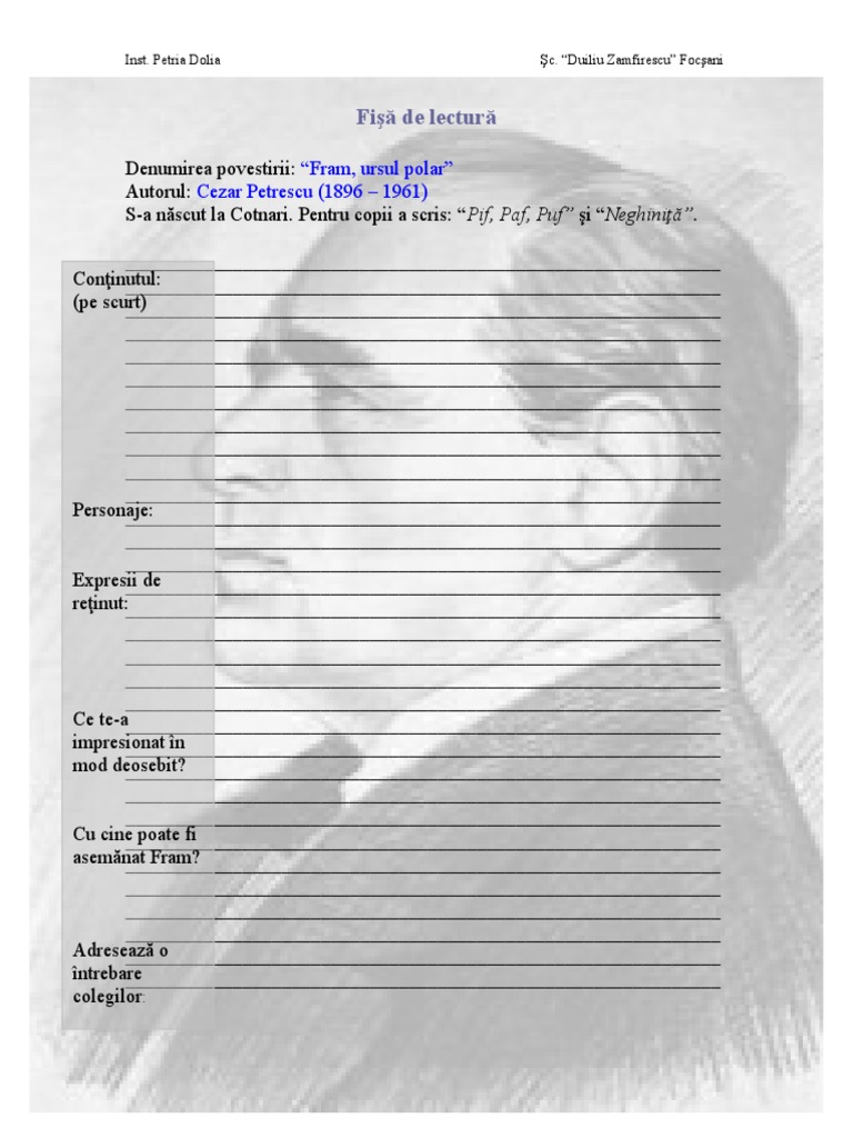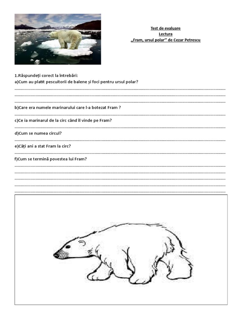 Portofoliu fram ursul polar acesta este un exemplu de portofoliu la limba romana pentru clasa a iv a realizat pe baza romanului fram ursul polar de cezar petrescu. Un rezumat preluat de pe wikipedia și un rezumat scurt al celebrei povestiri fram ursul polar în care este vorba despre ursul fram de la circul din struțki care devine trist deoarece se gândește la copilăria lui de la polul nord. Fisa de lectura fram ursul polar. Fram inseamna inainte in limba norvegiana.