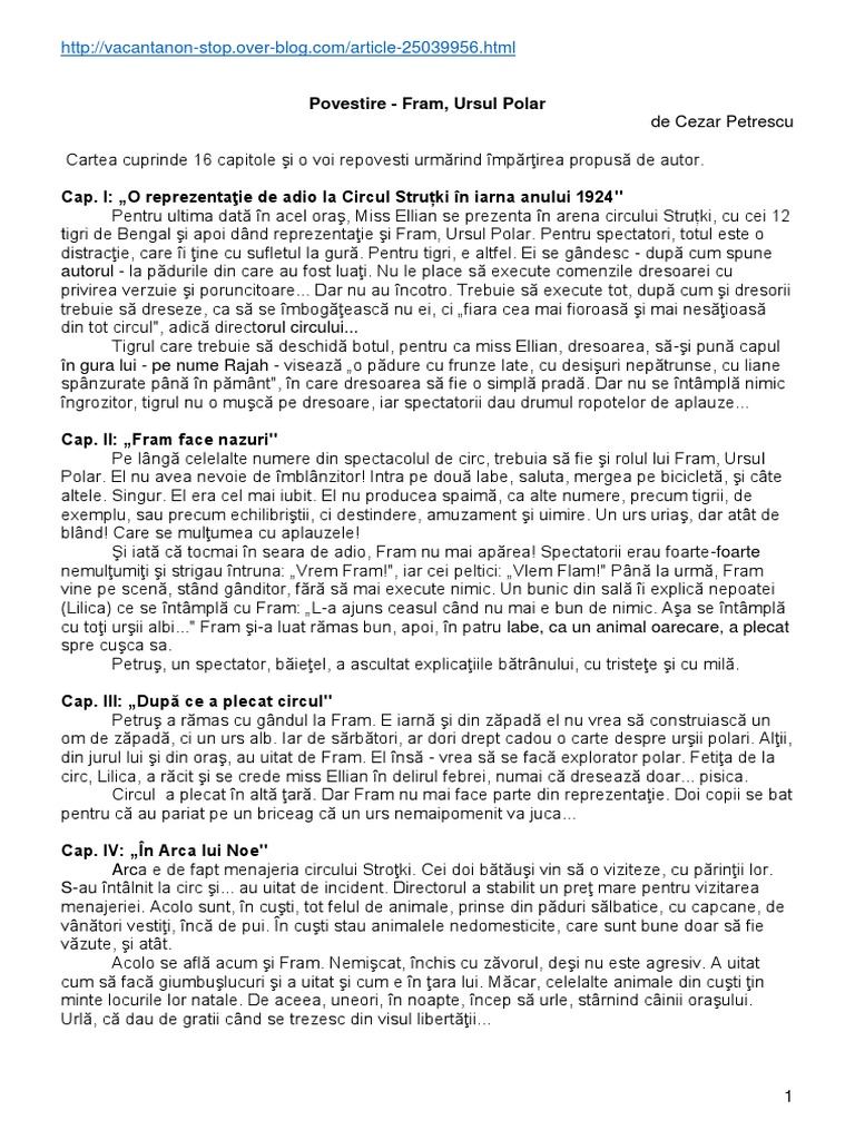 Fram ursul polar de cezar petrescu rezumat pe scurt si biografie literatura romana comentarii fișă de lectura rezumat eseu cărți de specialitate cezar petrescu biografie pe scurt si opera cezar petrescu se naste la 1 decembrie 1892 in localitatea hodora cotnari judetul iasi. La circul struțchi are loc ultima reprezentație. Vede privirea mirată a ursulețului care nu înțelegea de ce nu plătise moartea mamei cu moartea ucigașului. 1 fram ursul polar fram ursul polar rezumat 15 capitole fram sotia lui nansen dadu nume unei corabii fram care inseamna inainte si astfel marinarul lars d 2 fram ursul polar de cezar petrescu fram ursul polar rezumat 15 capitole fram se adapostii intr un adapost de gheturi se incalzi.