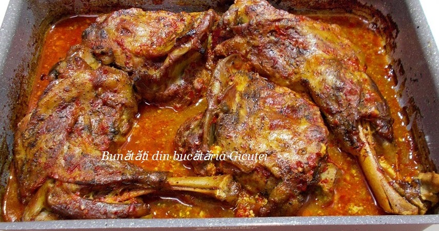 Dam tava acoperita cu folie de staniol la cuptor preincalzit in prealabil circa 45 min apoi dam folia la o parte si lasam sa se rumeneasca stropind din cand in cand cu baitzul din tava pana scade tot vinul. Se scoate folia si se mai lasa sa scada stropindu se des. Aromatizată cum trebuie şi lăsată o zi sau două la marinat veţi obţine o friptură de ied absolut delicioasă.