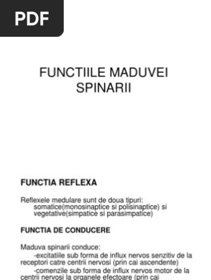 Functia reflexa a maduvei spinarii. Arcul lor reflex este constituit de doi neuroni reflexul rotulian ahilan etc b reflexele polisinaptice se mai numesc reflexe de flexie sau reflexe nociceptive de raspuns. Functia reflexa a maduvei spinarii a reflexele mososinaptice se mai numesc reflexe miotatice sau osteotendinoase din extensie. Măduva spinării este un element component al sistemului nervos central care conectează creierul cu restul corpului. Maduva spinarii in imagini.