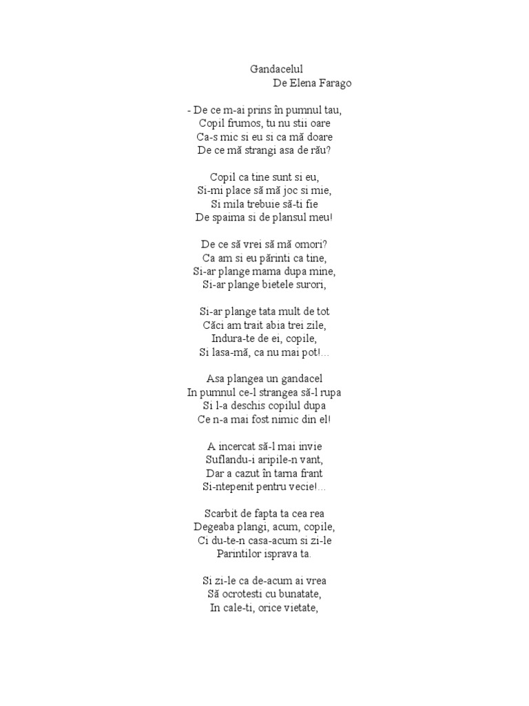 De ce m ai prins în pumnul tău copil frumos. Gandacelul de elena farago comentariu elena farago desi majoritatea scrierilor sale pentru copii sunt in versuri elena farago este si autoarea unor carti in proza la fel de apreciate de a lungul timpului de cei mici. Scarbit de fapta ta cea rea degeaba plangi acum copile ci du te n casa acum si zi le parintilor isprava ta. Se pare că poezia gandacelul de elena farago este unul foarte popular din moment ce are.