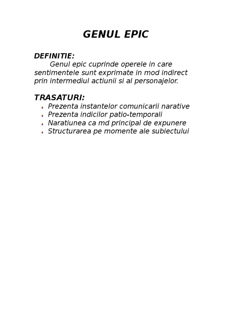 Gen epic definitie si trasaturi. Genul epic cuprinde totalitatea operelor literare populare și culte în proză sau în versuri în care gândurile ideile și sentimentele autorului sunt exprimate în mod indirect prin intermediul acțiunii și al personajelor antrenate în derularea evenimentelor plasate într un anumit timp și spațiu. Operele literare au o serie de particularități care permit clasificarea acestora în unul dintre cele trei genuri literare. Opera epica este opera literara in care mesajul este transmis in mod indirect prin intermediul personajelor naratorului si a actiunii. Genul literar are la bază un anumit mod de transmitere a ideilor și a sentimentelor precum și o anume modalitate de organizare a textului.