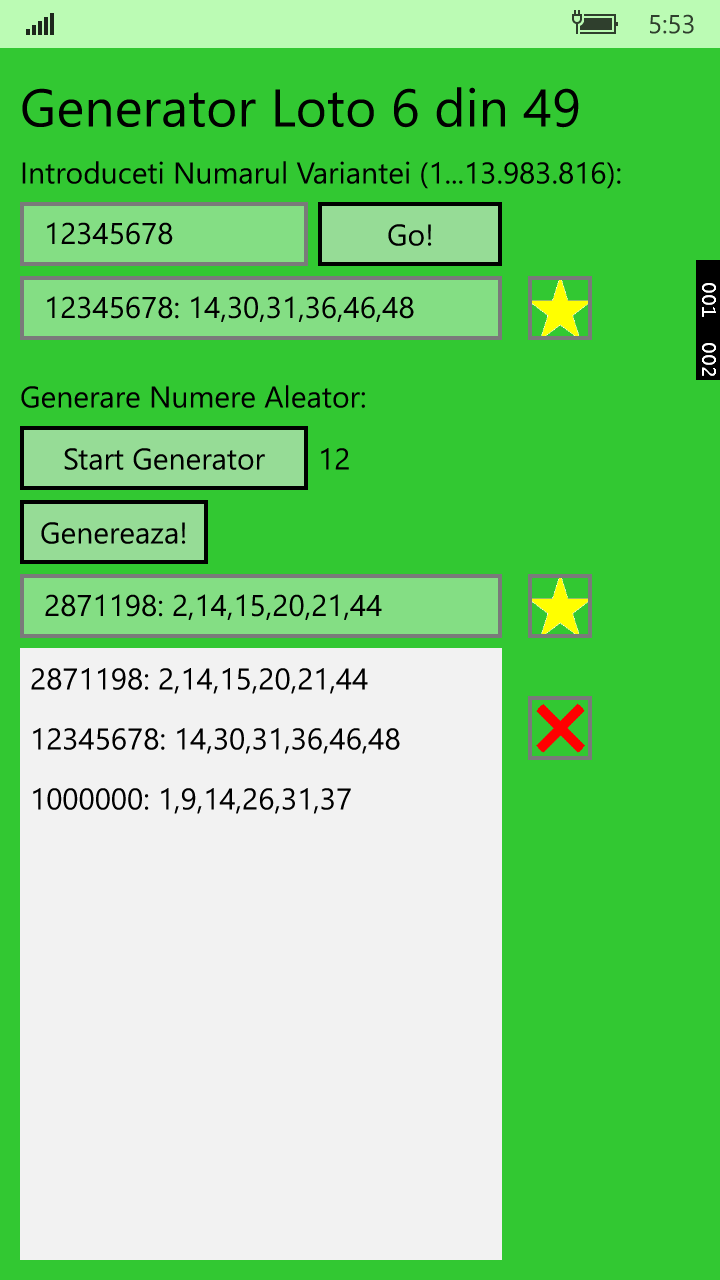 Generator numere 6 49. A lottery number generator that will generate up to 10 sets of numbers that can be entered for canada 6 49 draws. Generator loto este o aplicatie care iti extrage in mod aleatoriu numere pentru loto 6 49 loto 5 40 si joker. The lotto 6 49 random number generator has been created to provide you with a way of generating numbers without relying on lucky dip selections. 90 numărul de seturi pentru a genera.